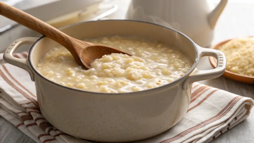 Cozinhe em fogo baixo por cerca de 30 a 40 minutos, mexendo com frequência para que o arroz não se pegue no fundo da panela e para que a mistura não derrame. O segredo é mexer com paciência: isso ajuda a liberar o amido do arroz e dá aquela cremosidade deliciosa. Você pode ajustar o tempo conforme o ponto do arroz (mais firme ou mais macio).