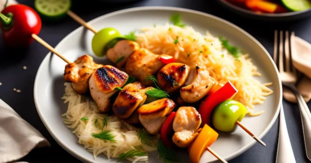 Brochetas de pollo a la parrilla con verduras y arroz salteado: receta completa y saludable