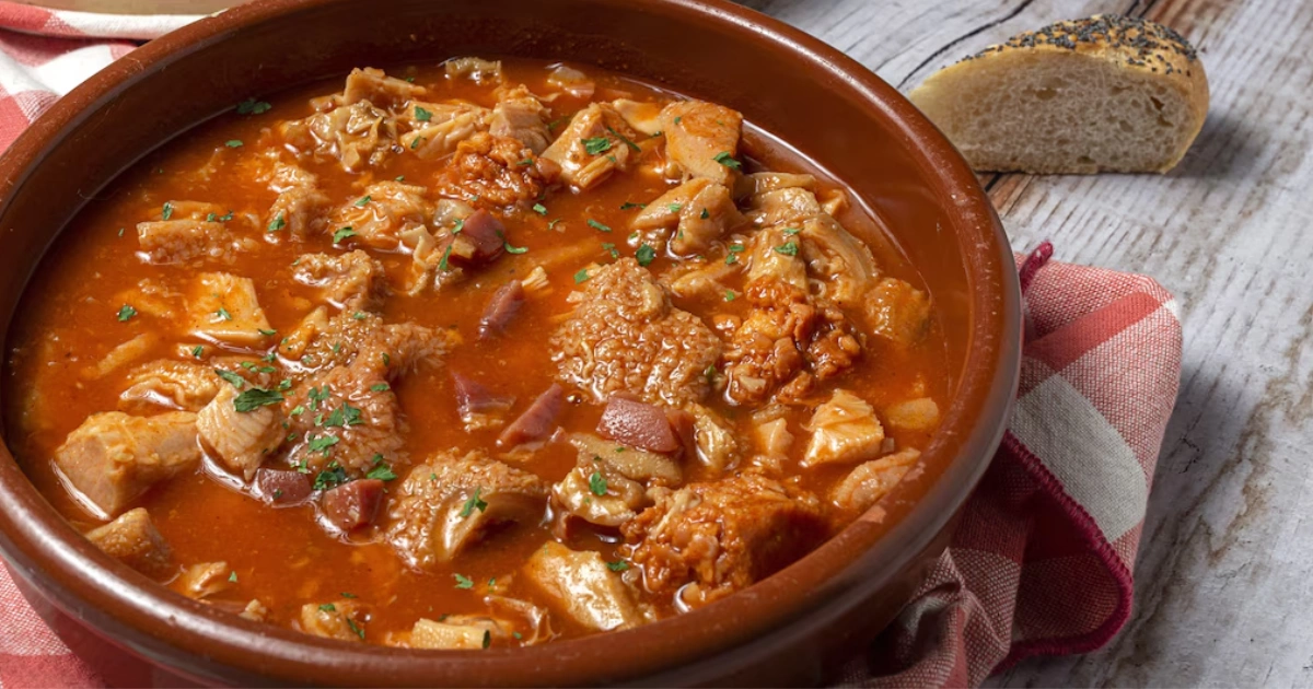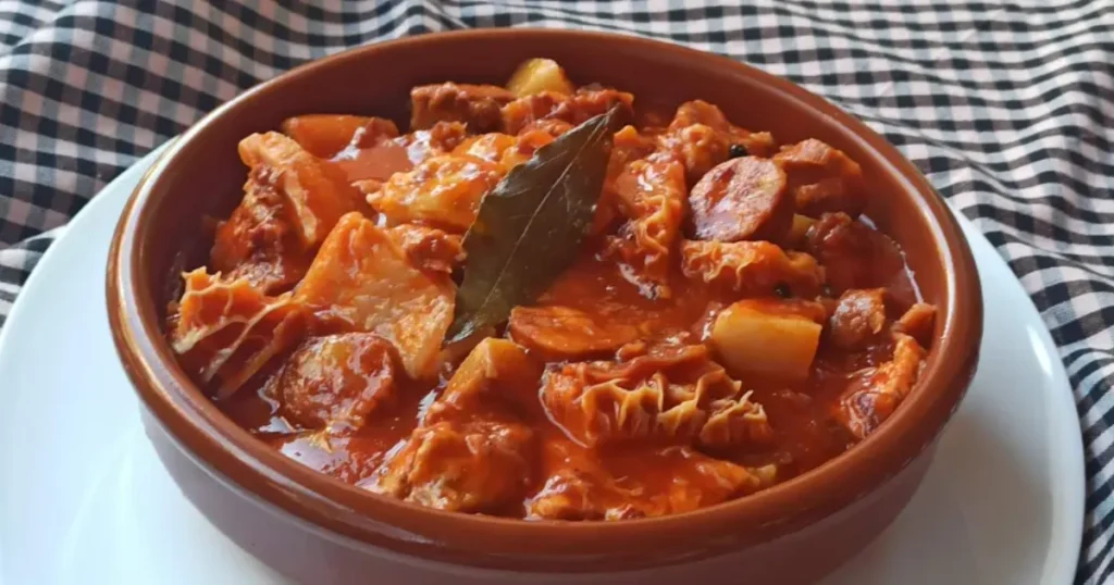 El ingrediente protagonista son las tripas de res o callos, un alimento tradicionalmente valorado por su aporte de colágeno y proteínas. Cuando se cocinan adecuadamente, adquieren una textura tierna y agradable. La adición de chorizo y jamón curado aporta cuerpo y profundidad, mientras que la salsa de tomate actúa como base reconfortante.