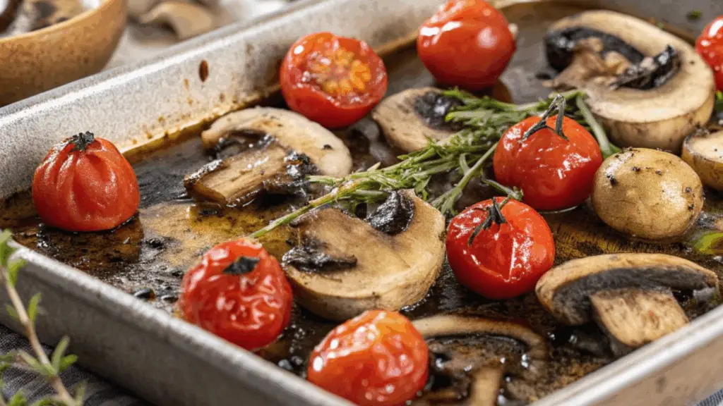 • No sobrecargues la bandeja de horno: Asegúrate de que los champiñones y tomates estén bien distribuidos, de lo contrario, podrían soltar mucha agua y no se dorarán correctamente.