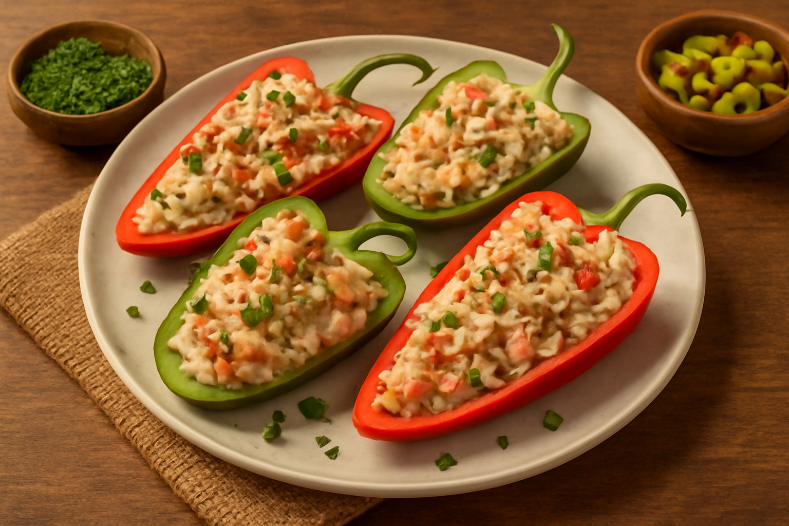 Se trata de pimientos o chiles asados y rellenos con una mezcla de pollo desmenuzado y vegetales frescos, marinados en jugo de limón y condimentados con hierbas típicas mexicanas. El resultado es un plato fresco, ligeramente picante y muy aromático, perfecto para disfrutar en familia o como botana en reuniones.