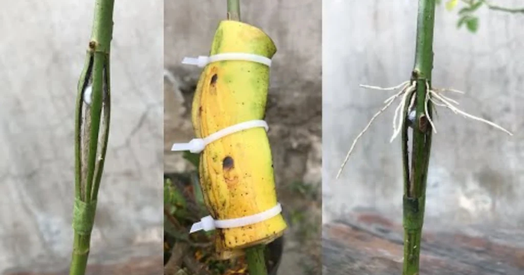 Envuelve la parte pelada con un trozo de piel de plátano. Este ingrediente natural aporta potasio, calcio y enzimas que favorecen el crecimiento de las raíces. Puedes agregar también un poco de tierra húmeda o musgo sphagnum para mantener la humedad.