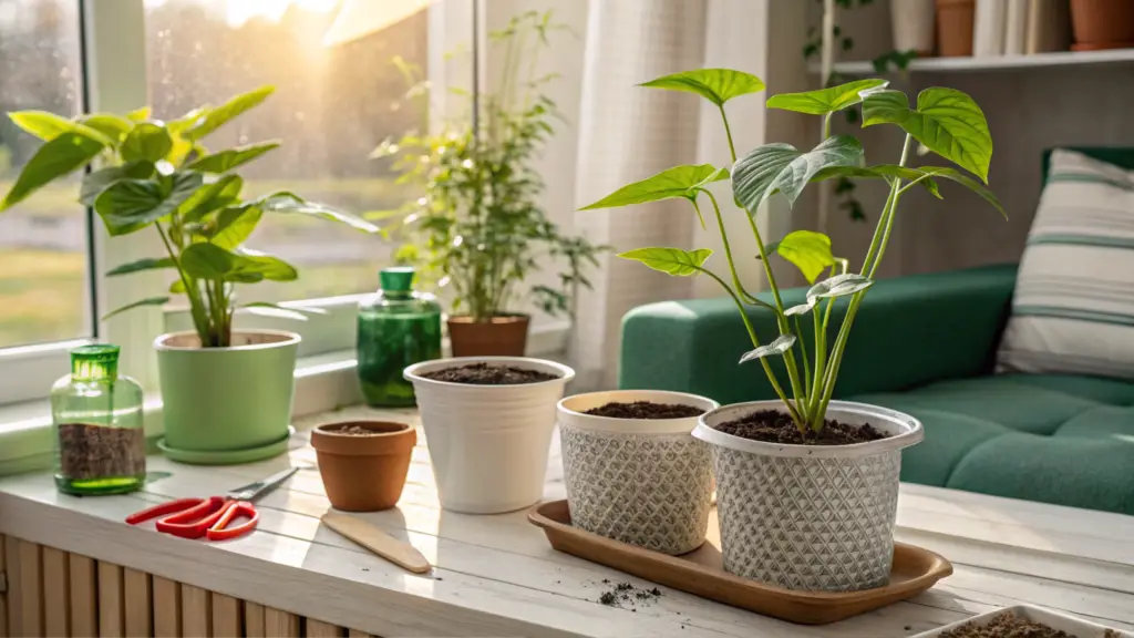 1. Preparación: Al trasplantar tu syngonium madre, observa si tiene varios tallos que pueden separarse. Este es un buen momento para dividir.