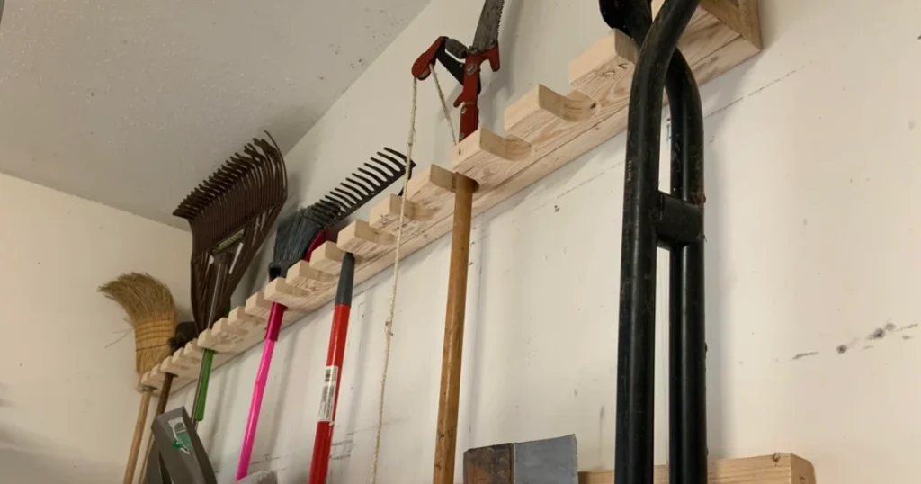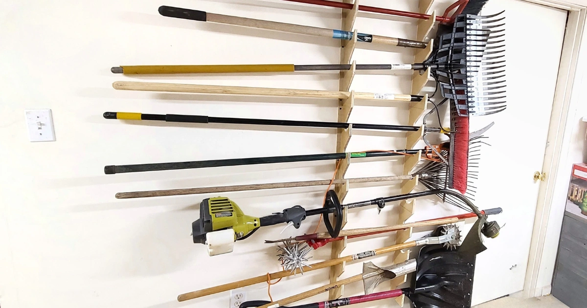 Las herramientas que usas con más frecuencia, como las podadoras, las palas y los rastrillos, deben estar cerca. Las herramientas de uso ocasional pueden ir en estantes más altos o bajos.
