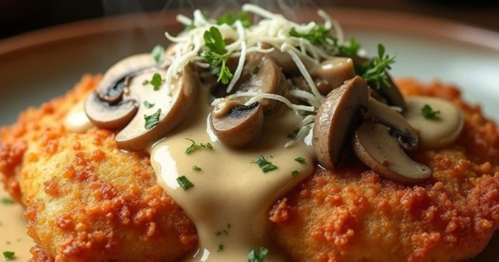 Coloca las escalopas doradas en un plato y vierte la salsa cremosa de champiñones por encima. Sirve inmediatamente para que el pollo conserve su textura crujiente.