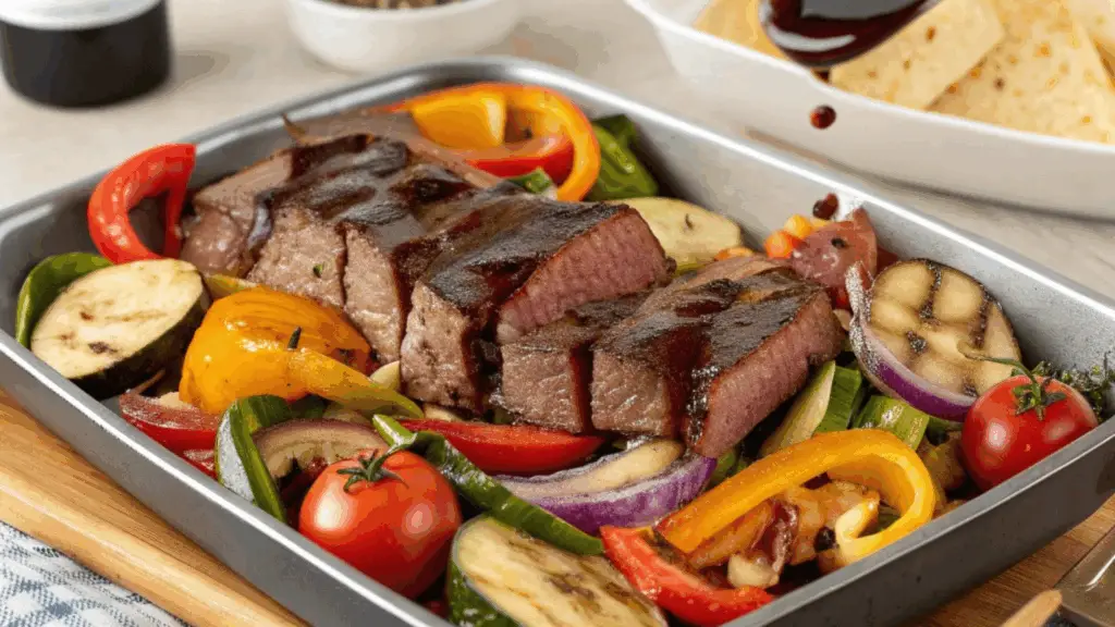 Un delicioso filete de res con una salsa balsámica, acompañado de verduras asadas, todo cocinado en una sola sartén. ¡Fácil de preparar, lleno de sabor y perfecto para una comida saludable!