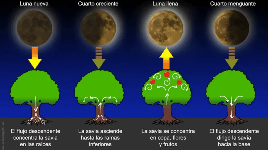 La luna afecta el movimiento de la savia y la humedad en las plantas. Durante la fase de la luna creciente o en plenitud, la savia circula hacia las partes superiores de la planta, favoreciendo el crecimiento y la unión de los injertos.