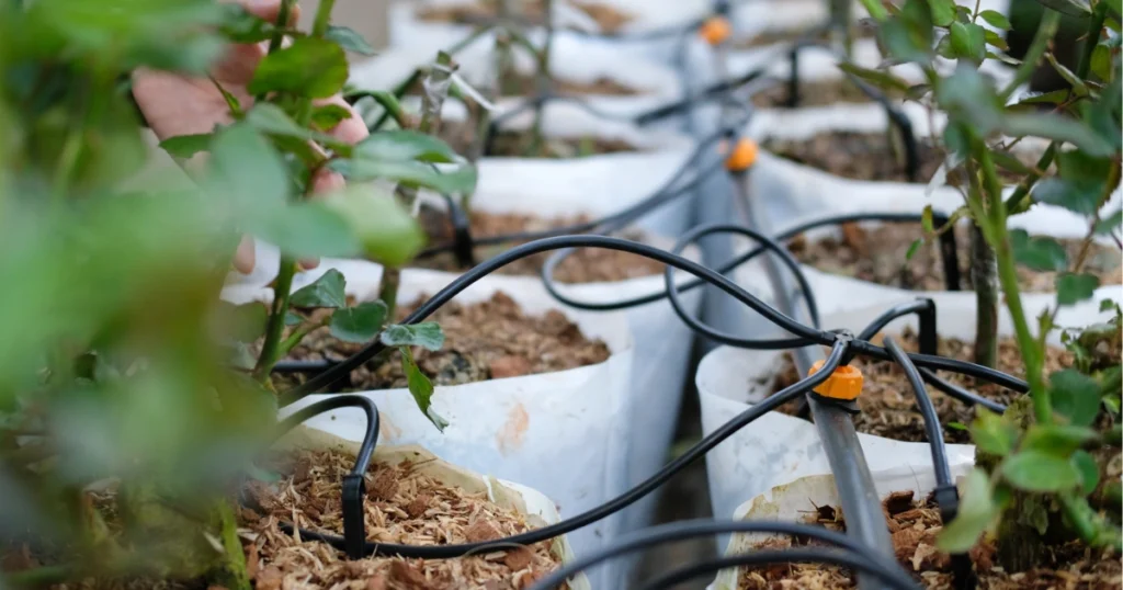 Este tipo de riego suministra el agua directamente a las raíces, evitando el exceso de riego y la evaporación superficial y manteniendo una humedad constante en el sustrato.