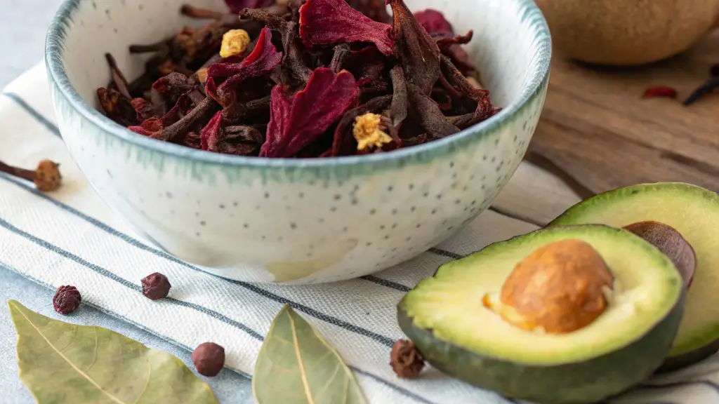 Paso 1: Coloca todos los ingredientes en una olla o cacerola. Esto incluye el puñado de flor de Jamaica, los clavos de olor, las hojas de laurel y la semilla de aguacate cortada en trozos.