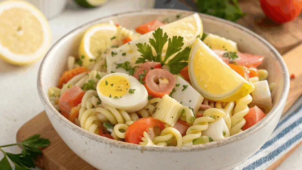 La Ensalada de Pasta con Surimi y Huevos Duros es un plato equilibrado, lleno de proteínas y frescura, ideal para los días calurosos o como un acompañamiento para carnes a la parrilla. Su versatilidad permite adaptarlo a muchos gustos y dietas, ¡y es tan fácil de preparar que seguramente se convertirá en uno de tus favoritos!