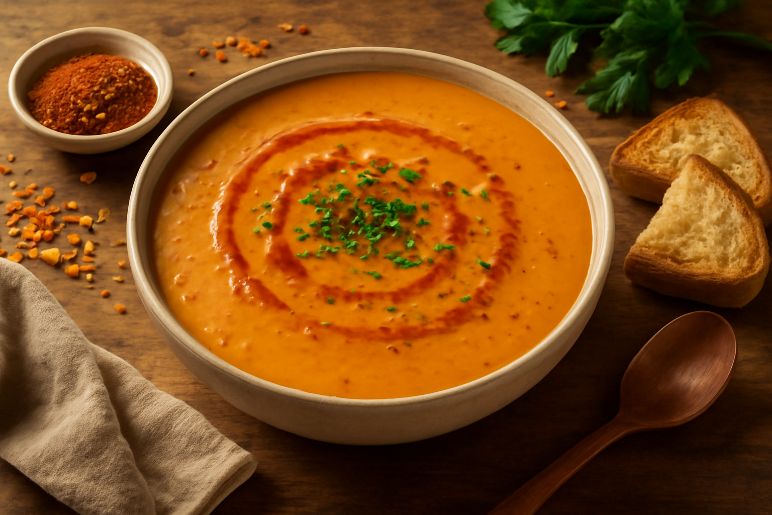 La Mercimek Çorbası es una sopa tradicional turca elaborada con lentejas rojas, especias aromáticas y verduras frescas que la convierten en un plato nutritivo, reconfortante y lleno de sabor. Perfecta para los días fríos o como entrada ligera, esta sopa es un clásico de la gastronomía de Turquía y de toda la región del Mediterráneo Oriental. Su textura suave y cremosa junto al toque justo de especias la hacen irresistible.