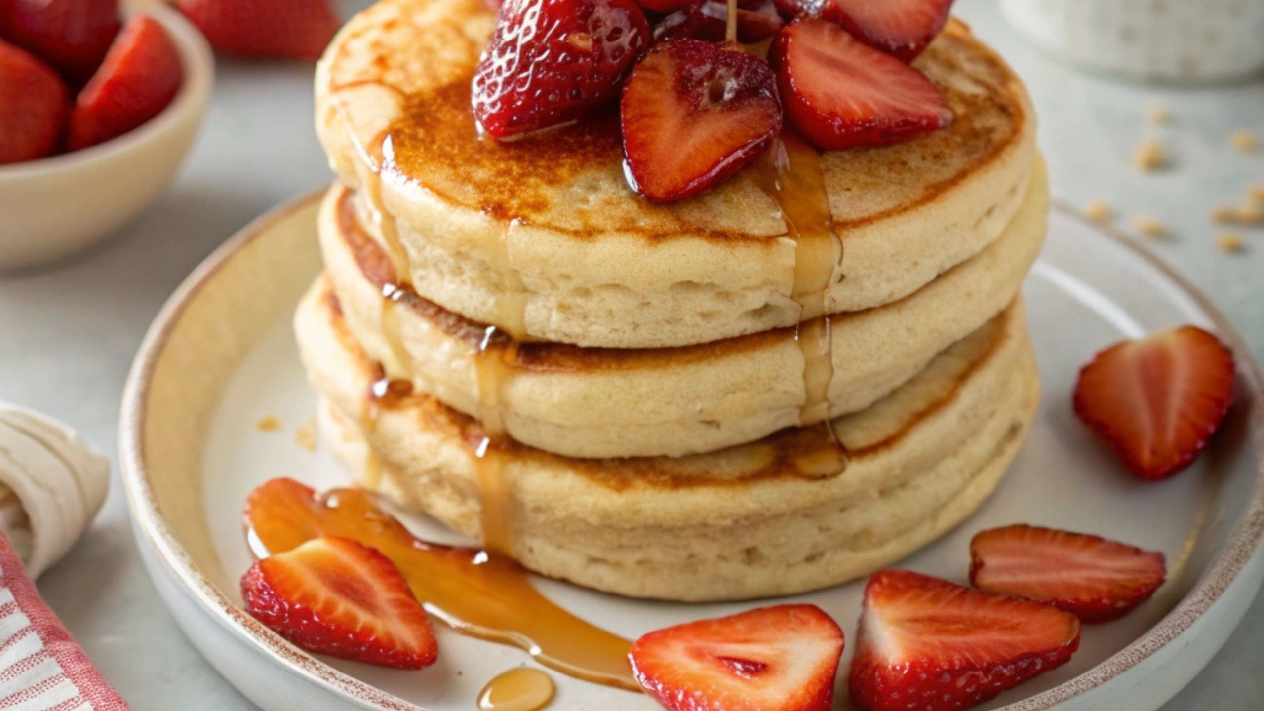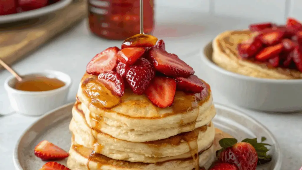 Panqueques Esponjosos con Fresas Frescas y Jarabe de Arce: ¡Deliciosos, Dulces y Perfectos para el Desayuno!