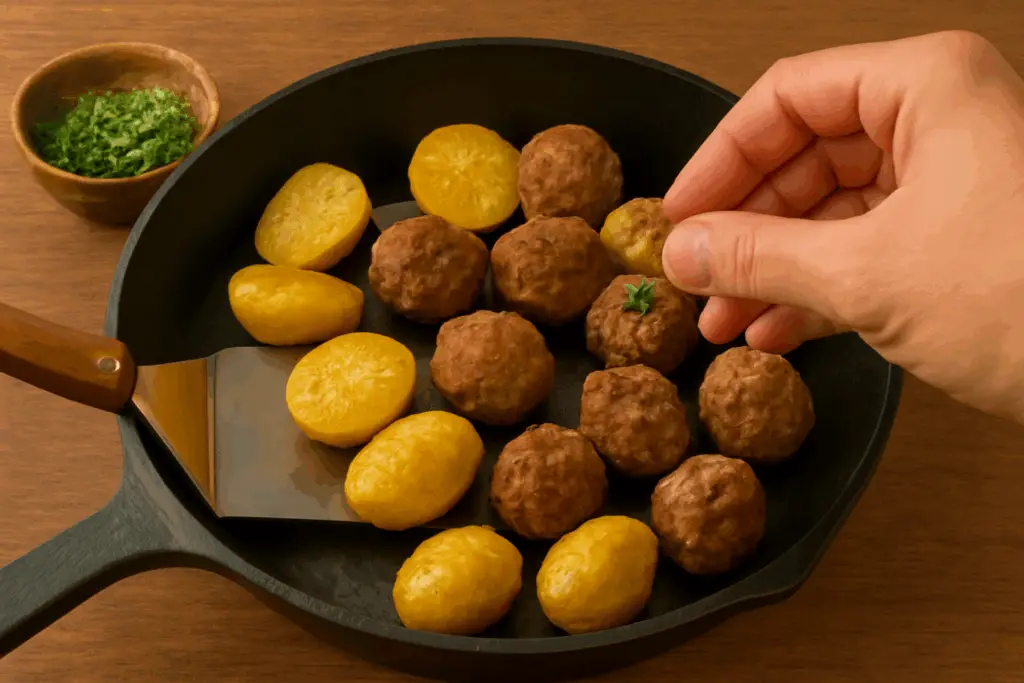 Papas Doradas y Albóndigas de Res Salteadas con Tomillo – ¡Un Clásico Reconfortante con Aroma a Hogar!