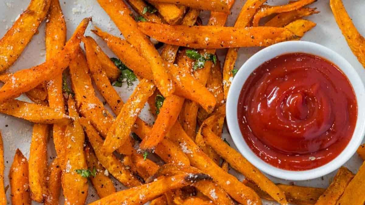 - Con Queso: Para un toque extra de sabor, puedes espolvorear queso parmesano rallado sobre las papas fritas de batata justo antes de que terminen de hornearse. Esto les dará un toque crujiente y sabroso.