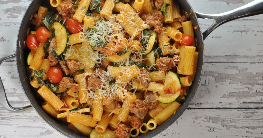 Pasta con calabacín, tomates cherry y salchicha: receta mediterránea fácil y deliciosa
