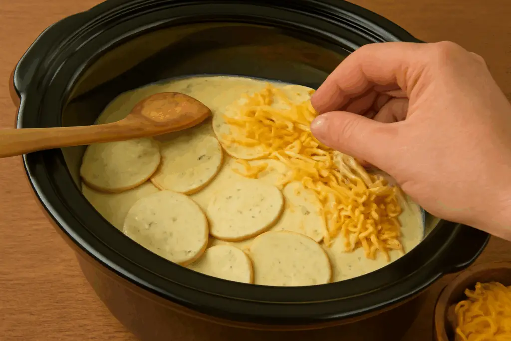 Engrasa ligeramente el interior de la olla de cocción lenta con mantequilla. Coloca una capa de rodajas de patata en el fondo, vierte un poco de la mezcla cremosa y espolvorea un poco de queso rallado. Repite las capas hasta acabar con todos los ingredientes, terminando con una capa generosa de queso.