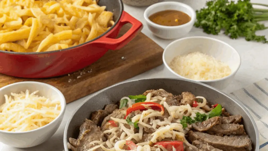 Ingredientes para la Philly Cheesesteak Pasta 🍝🥩🧀