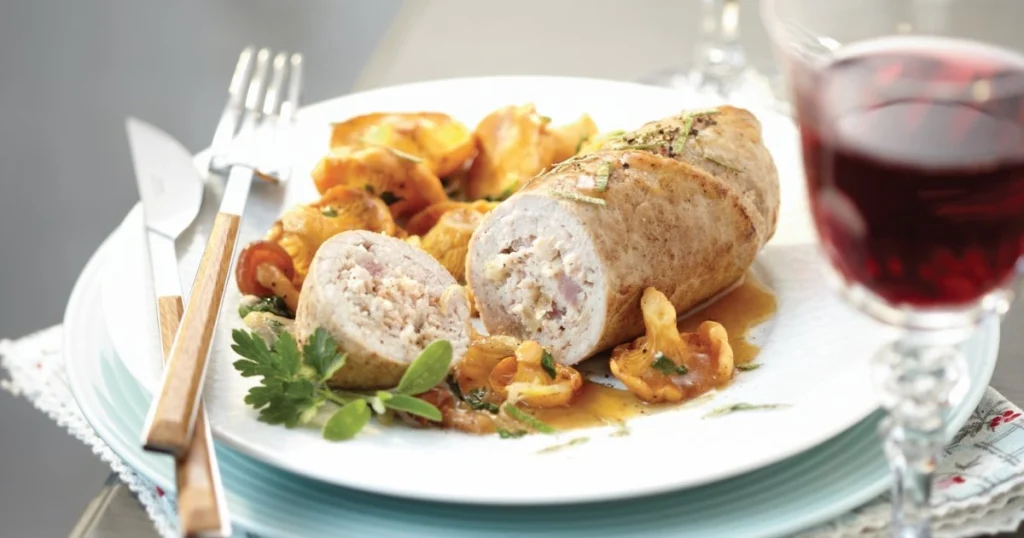 Pollo relleno con champiñones y hierbas en salsa cremosa