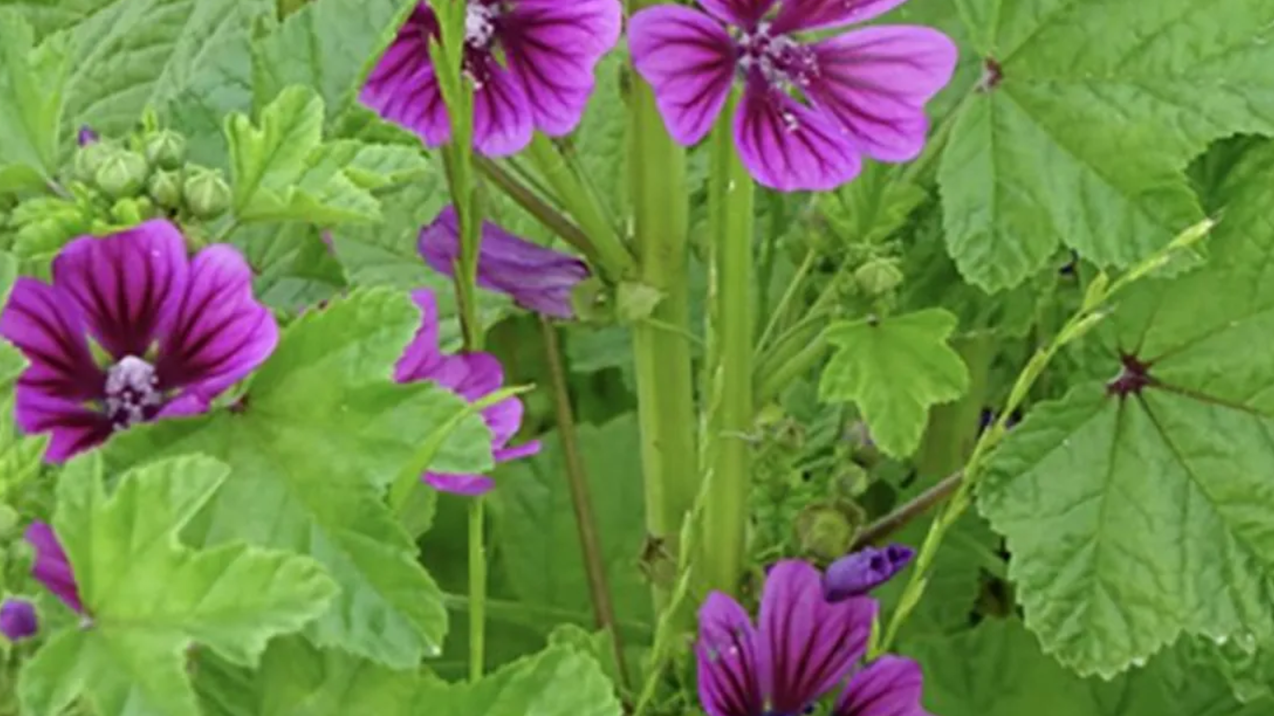 Las malvarrosas, conocidas científicamente como Malva sylvestris, son plantas herbáceas que suelen crecer de forma espontánea en terrenos variados. Tienen hojas grandes, de color verde intenso, y flores de tonos rosados o violetas, que aportan un toque ornamental muy bonito en cualquier jardín.