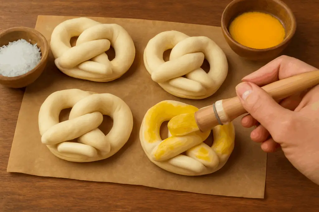 • El baño en agua con bicarbonato es clave para la textura y color clásicos del pretzel.