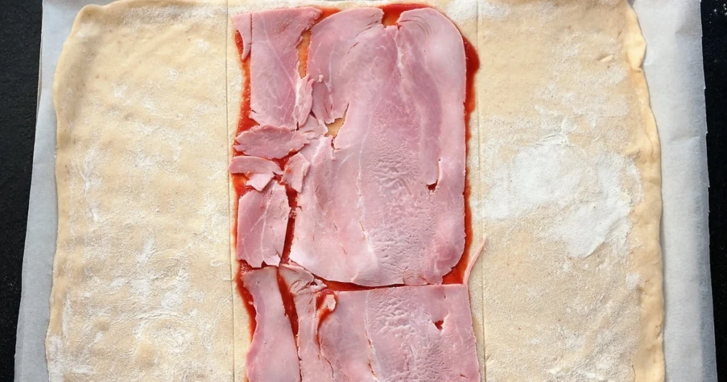 Distribuye el jamón cortado en pequeñas tiras sobre la masa de manera uniforme. Si prefieres una opción vegetariana, puedes utilizar queso rallado. Ambos ingredientes funcionan perfectamente en esta receta.