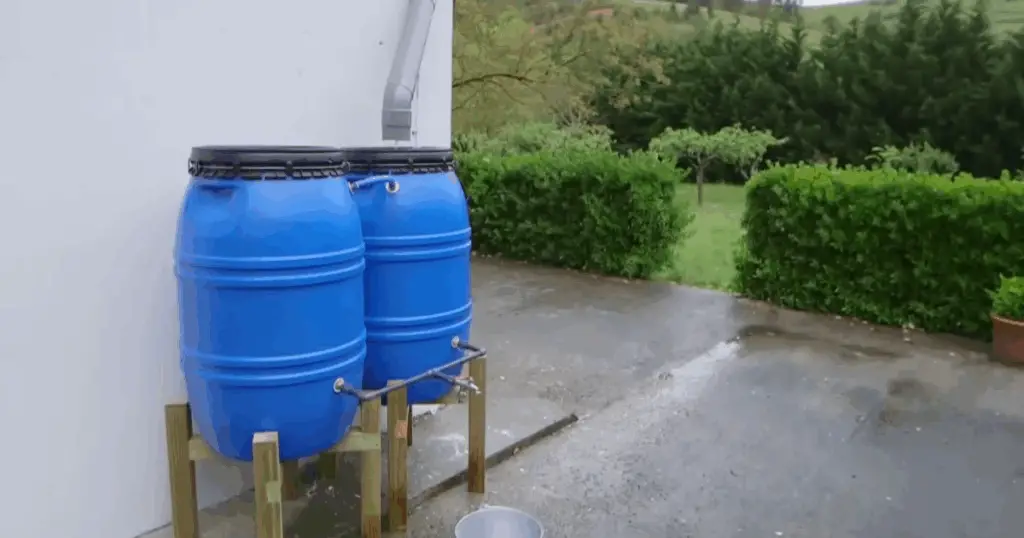 La imagen muestra un ejemplo práctico y funcional de un sistema de recolección de agua de lluvia fabricado con barriles plásticos reciclados. Este tipo de instalación se ha vuelto muy popular entre quienes buscan reducir el consumo de agua potable, aprovechar los recursos naturales y adoptar hábitos más sostenibles en el hogar o el jardín.