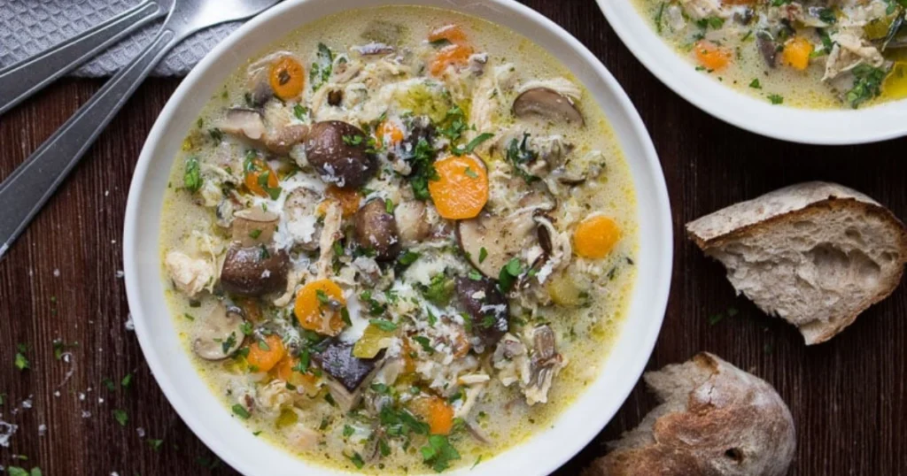 Sopa cremosa de pollo con arroz salvaje y champiñones: receta nutritiva y fácil