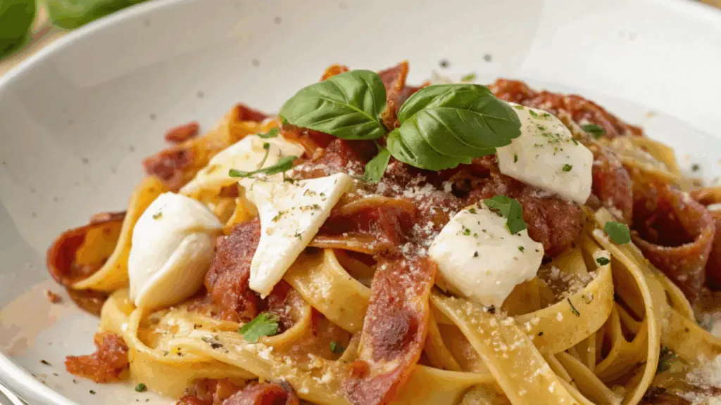 Tagliatelle con Pancetta, Albahaca y Mozzarella: ¡Un Plato Clásico Italiano Lleno de Sabor! 🍝🥓🌿🧀