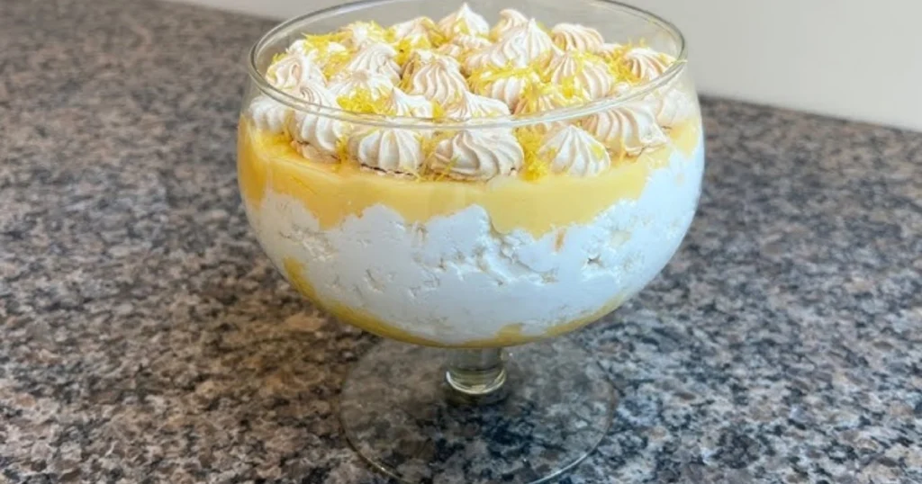 Este postre combina una base de bizcocho esponjoso, una crema de limón suave, crema chantilly y una capa final de merengue ligeramente dorado. El resultado es un trifle de limón con una presencia elegante y un sabor equilibrado.